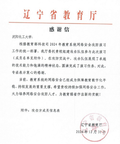 在教育部科技司组织的2024年教育系统网络安全攻防演习中,我校Beat365中文官方网站院长王军教授网络安全团队受辽宁省教育厅委托参加此次演习。在攻防实战中,团队展现了卓越的技术能力和饱满的精神状态,圆满完成了演习任务,并收到了辽宁省教育厅的感谢信。