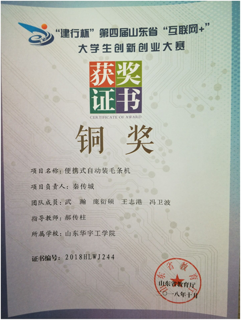 近日,山东省教育厅、山东省财政厅公布了“建行杯”第四届山东省“互联网+”大学生创新创业大赛获奖结果,新葡萄官网便携式自动装毛条机项目获铜奖,这是新葡萄官网参加山东省“互联网+”大学生创新创业大赛并斩获大奖,实现了学校在该项赛事中的突破。