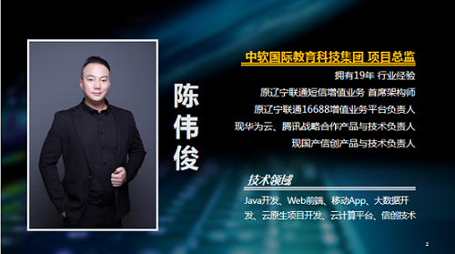 陈伟俊:现任中软国际教育科技集团项目总监,华为云、腾讯战略合作和国产信创产品与技术负责人,拥有19IT行业从业经验。